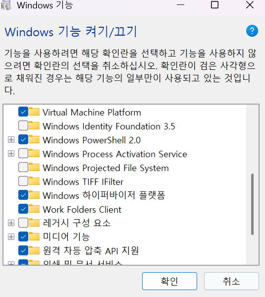 WslRegisterDistribution failed with error: 0x80370114 에러가 있을 때 대처법: 제어판-프로그램 기능-Windows 기능-Windows 하이퍼바이저 플랫폼 or Linux 하위 시스템 or Virtual Machine Platform 체크 확인, 나의 경우 Windows 하이퍼바이저 플랫폼 체크를 하지 않아서 생긴 문제였음..